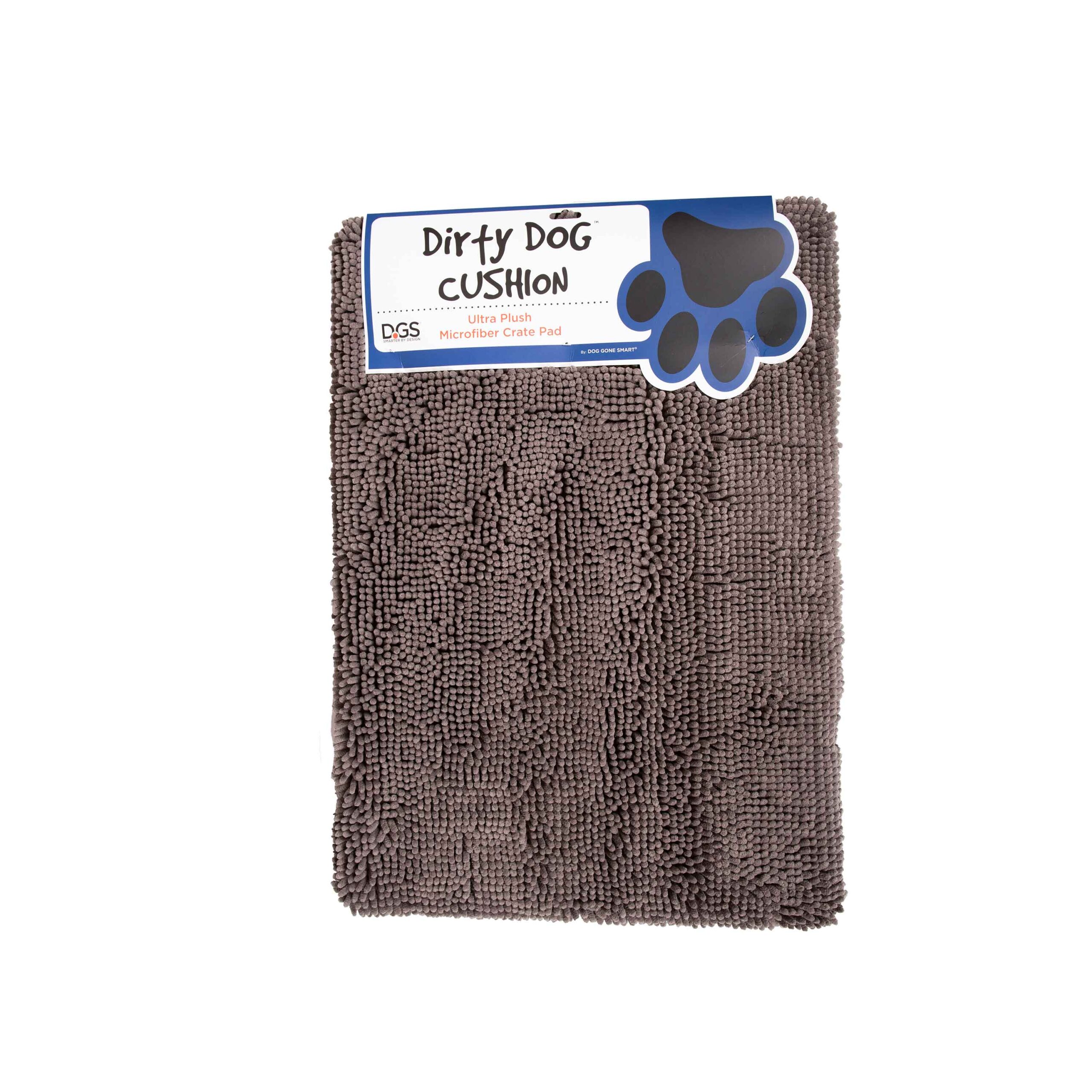 The Dirty Dog Doormat just got…cushionier. Dogs already love the Dirty Dog Doormat. At home, in the car, kitchen, bathroom, garage, wherever… With it’s soft plush feel and comforting texture, the Dirty Dog Doormat quickly went from paw wiper into a favorite place to lie or take a snooze. The Dirty Dog Cushion takes that comfort to a new level with more of what dogs already love and great health and safety benefits you’ll appreciate. But we didn’t want to just “puff up” a doormat…this cushion pad is designed for comfort and convenience. Antimicrobial microfiber cushion pad with a thick polysheet insert Removable microfiber cover with hidden zipper and water resistant liner Anti-skid bottom helps keep cushion in place Fits most standard size crates Machine washable