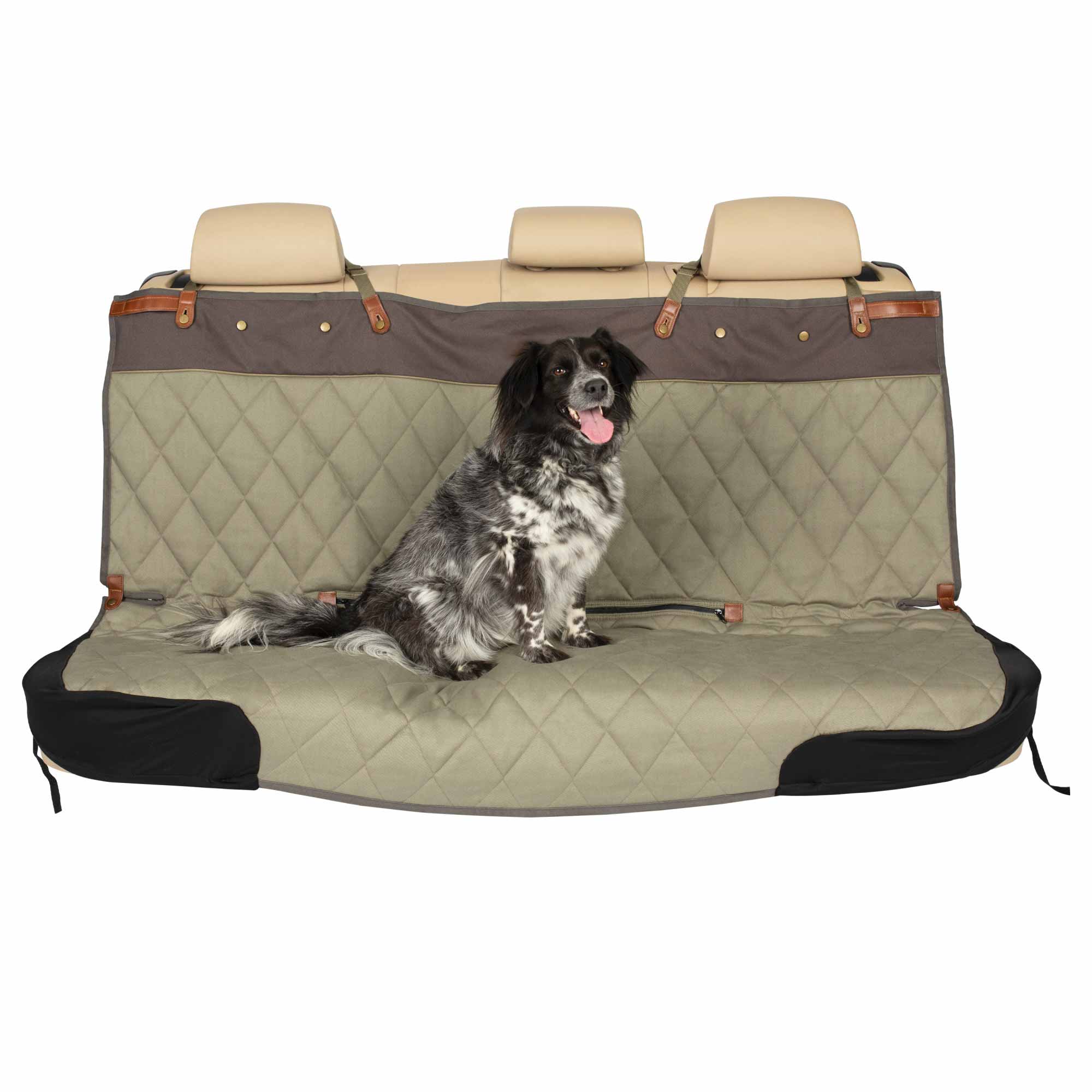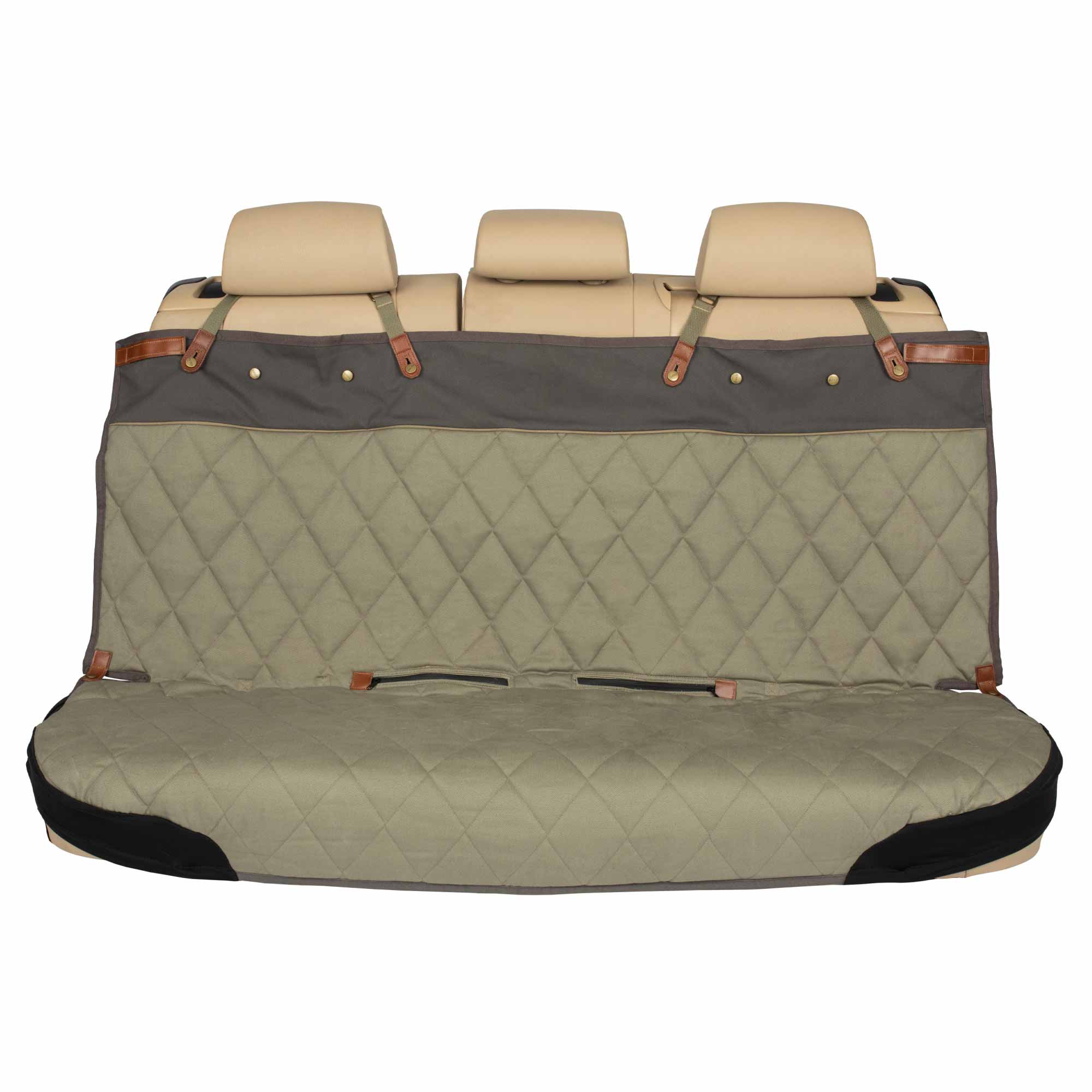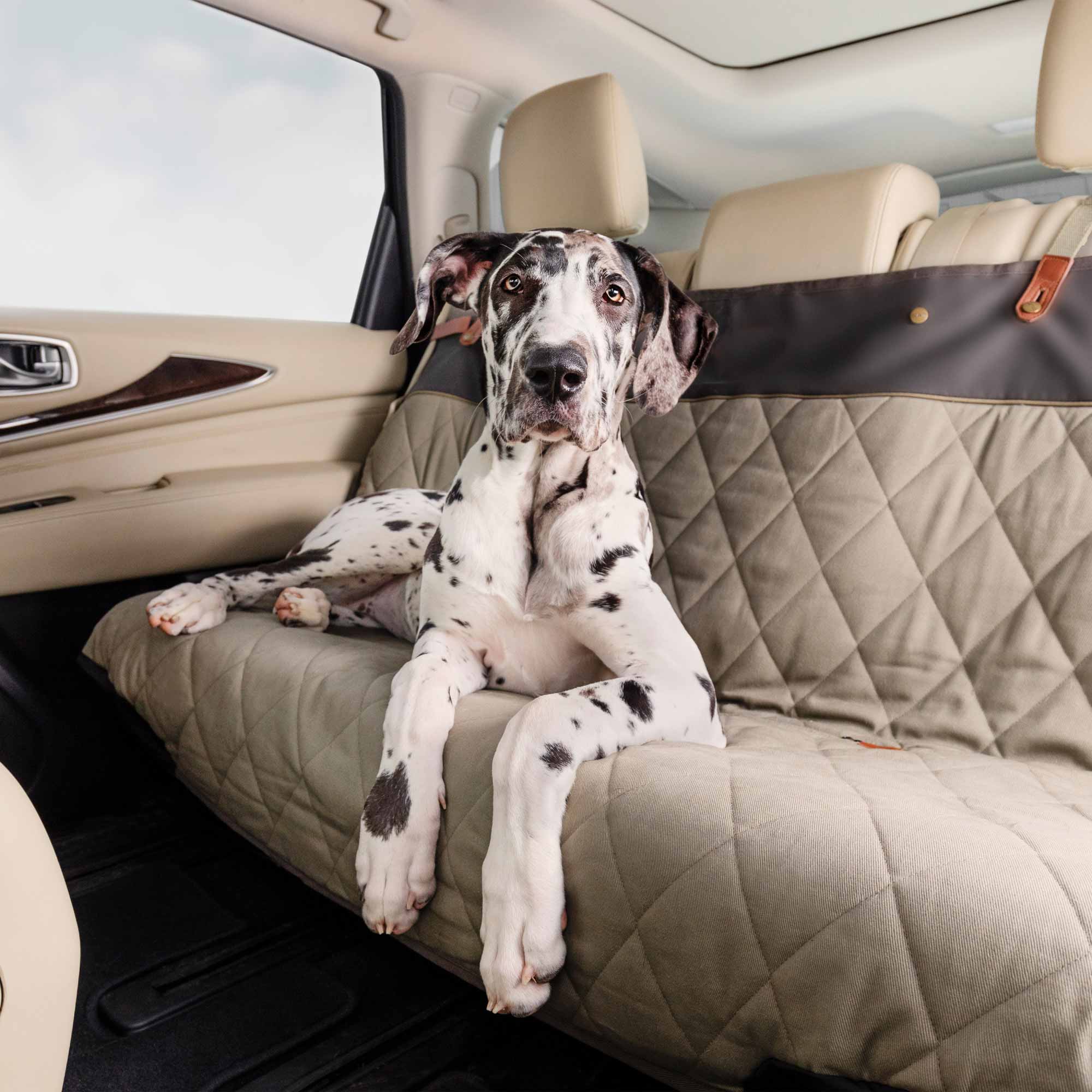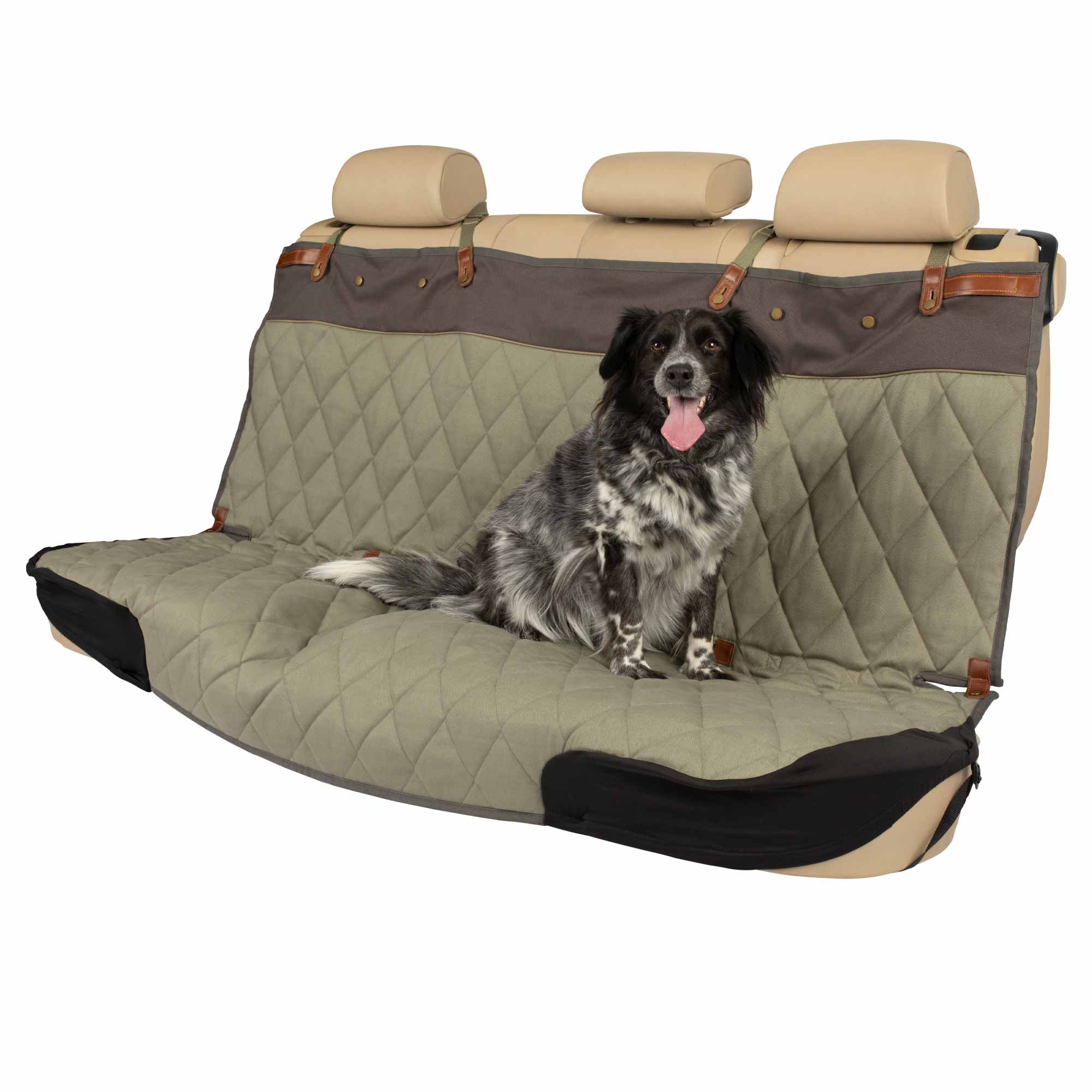 The PetSafe Happy Ride Quilted Bench Seat Cover, made with heavy cotton twill fabric, provides extra durability to protect your seats from dog hair and wet, muddy paws. This waterproof bench seat cover fits the back seat of most cars, trucks and SUVs, measuring 45 inches long by 56 inches wide. The cover is easy to use; just secure the head straps and seat anchor tubes in place and use the elastic panels and lower straps to keep the cover snugly fit to your car seat. If your seat cover is ready to be cleaned at the end of a fun-filled day with your best friend, simply toss the cover into your washing machine. PetSafe brand is here to help you and your pet live happy together. Fits the back seat of most cars, trucks and SUVs Leather headrest straps and heavy-duty zippers for extra durability Waterproof and scratch resistant Padded, quilted cotton twill fabric Machine washable