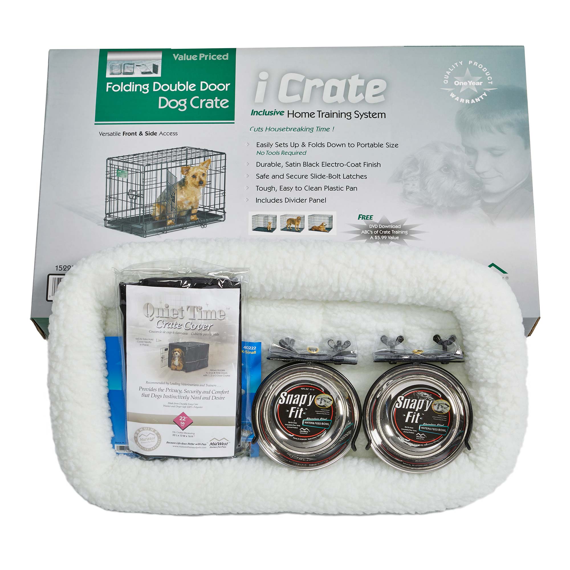Everything you need arrives in one box. The icrate was designed completely around the safety, security and comfort of your dog. Two doors for easy access to your pet inside either thru the traditional front door or from the side with the second door. The dog crate comes to you equipped with every feature you can think of: a composite plastic pan for easy cleanup in the event of an accident; plastic carrying handle to move the dog crate from one location to another comfortably; safe and secure slide bolt latches for the safety and security of the pet inside and the furniture on the outside; and most importantly a FREE divider panel for use while your puppy is still growing up. The easy-to-use crate cover simply slips over the top of your Midwest crate. The crate cover offers proper ventilation and can be used with 1, 2, or 3 door crates, allowing entrance and access from multiple sides. The crate cover also allows access to the slide-out plastic pan in your crate for easy removal and cleaning. The Snap’y Fit patented system holds the bowl firmly in place and yet, allows easy removal. Pet parents have been frustrated for years with conventional water bowls because pets can dislodge the bowls and spill the food and water. The Snap’y Fit patented system solves this problem. 2 door iCrate with plastic pan and divider panel The Quiet Time Fleece Pet Bed is one of a kind fleece pet bed that has an ultra -soft synthetic sheepskin. Crate cover providsyour pet with a relaxing environment to sleep while you are away! 2 Snap’y Fit food and water bowls attach to you crate with ease