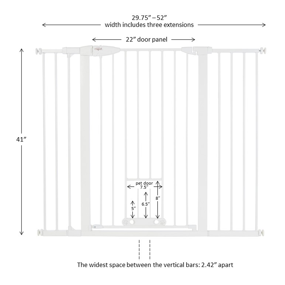 This hard-to-climb gate stands 41” high and will keep most breeds safely contained in their own space. The patented EasyPass pet door makes this gate truly unique. The small door retracts up into the gate tubing at three height intervals (5”, 6.5” & 8”) so it can be left open at the desired height, depending on your pet’s size. This pet door allows smaller dogs and cats the freedom to come and go while larger pets stay contained. When it’s time to close the cat door, simply use the designated slots found on the door and squeeze to gently bring the door down – no annoying dog door that’s been left open to trip over! This pet gate features an extra wide 22” door that includes a large easy-grip handle designed to fit snuggly in your hand. To control the direction that the gate swings, a swing control lever allows you to decide – swing in one direction or allow the gate to swing in both directions. For those times when you want the gate to quickly remain open, just move the door past 90 degrees and the hold-open feature will kick in. The contemporary white finish on this sturdy steel construction gate is chew-proof and will complement your home decor. Quickly and easily install this pressure-mount gate with the twist of the tension mounts. This gate fits openings from 29.75 – 52 inches wide and comes with three extensions. Please note: When you unpack this gate you will notice that it is not square. This is normal and the gate is not damaged. It is manufactured at a pre-set angle so when it is installed properly in the opening, it will maintain the correct amount of tension and prevent it from being pushed out of the opening under normal use. Please read and follow the instruction manual carefully. Width: Adjusts to fit 29.75 – 52 inches wide Height: 41 inches Bar spacing 2.25 inches Pressure-mount gate is easy to use – extend tension knobs until gate fits tightly Patent pending pet door retracts up into gate tubing. Comes with 3 variable height settings: 5″, 6.5″, 8″