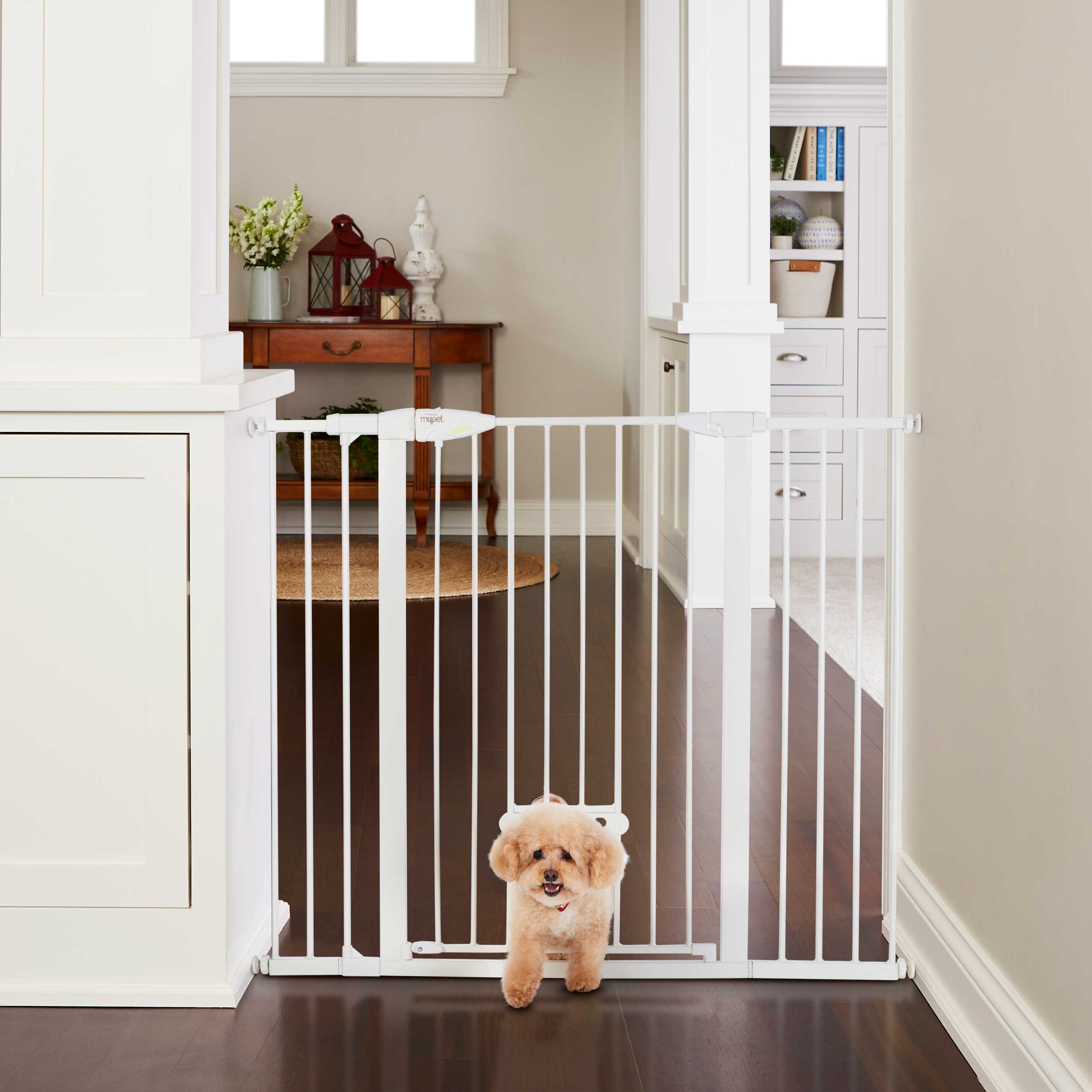This hard-to-climb gate stands 41” high and will keep most breeds safely contained in their own space. The patented EasyPass pet door makes this gate truly unique. The small door retracts up into the gate tubing at three height intervals (5”, 6.5” & 8”) so it can be left open at the desired height, depending on your pet’s size. This pet door allows smaller dogs and cats the freedom to come and go while larger pets stay contained. When it’s time to close the cat door, simply use the designated slots found on the door and squeeze to gently bring the door down – no annoying dog door that’s been left open to trip over! This pet gate features an extra wide 22” door that includes a large easy-grip handle designed to fit snuggly in your hand. To control the direction that the gate swings, a swing control lever allows you to decide – swing in one direction or allow the gate to swing in both directions. For those times when you want the gate to quickly remain open, just move the door past 90 degrees and the hold-open feature will kick in. The contemporary white finish on this sturdy steel construction gate is chew-proof and will complement your home decor. Quickly and easily install this pressure-mount gate with the twist of the tension mounts. This gate fits openings from 29.75 – 52 inches wide and comes with three extensions. Please note: When you unpack this gate you will notice that it is not square. This is normal and the gate is not damaged. It is manufactured at a pre-set angle so when it is installed properly in the opening, it will maintain the correct amount of tension and prevent it from being pushed out of the opening under normal use. Please read and follow the instruction manual carefully.