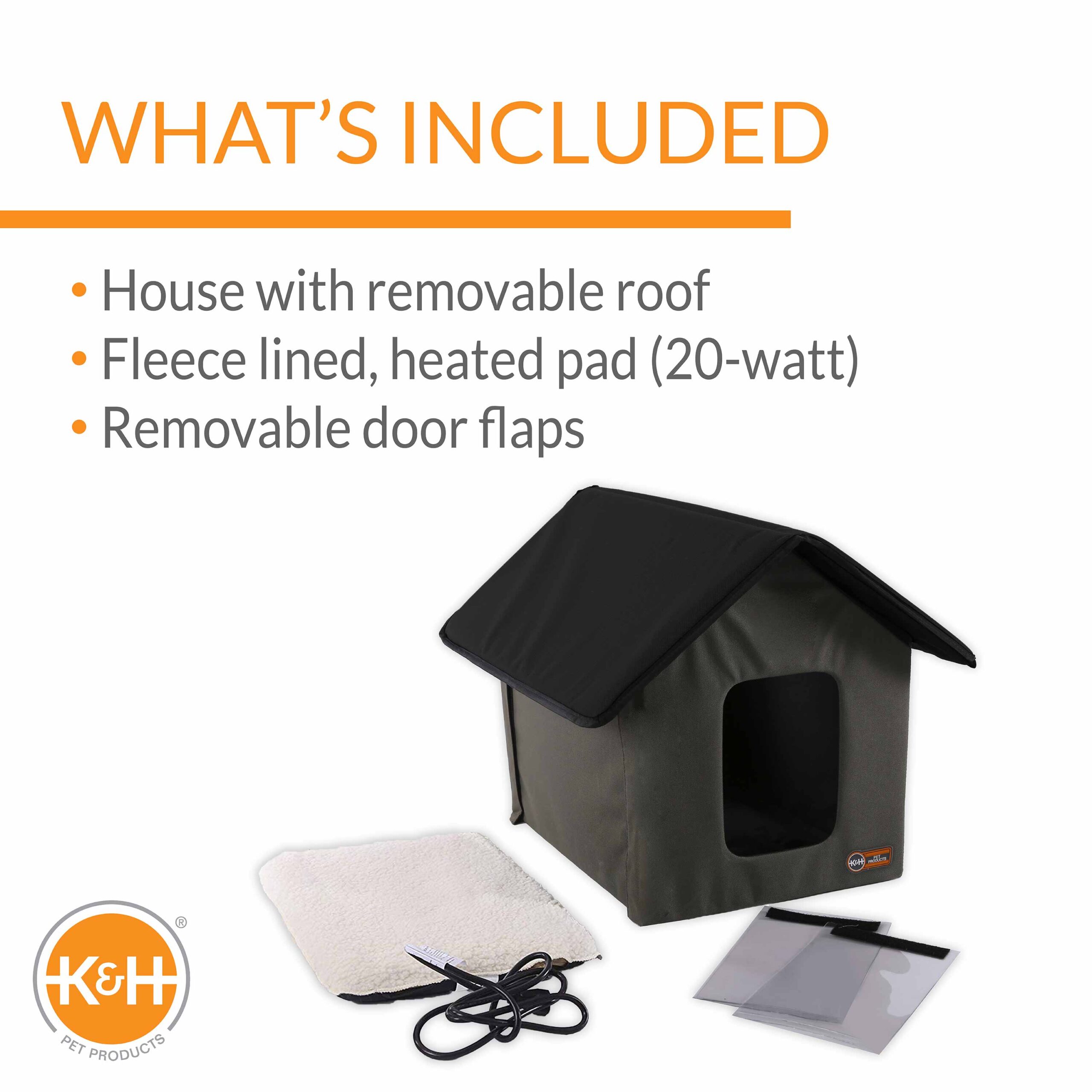 The included 20 watt MET Safety Listed Lectro-Soft Indoor/Outdoor Heated Bed inside the K&H Outdoor Heated Kitty House keeps your kitties warm all winter long, even in sub-zero temperatures. The K&H Lectro-Soft is thermostatically controlled by an internal preset thermostat to safely keep your pets warm. The K&H Outdoor Heated Kitty Houses are made with heavy denier polyester that makes it water/weather resistant. The walls and roof are insulated to protect your kitty from the harmful elements of winter. The roof of the K&H Outdoor Heated Kitty House hangs over the 2 doors to keep cats warm, safe and dry. The K&H Outdoor Heated Kitty House features two exits with removable plastic flaps so pets cannot be trapped by predators and yet still have sufficient protection. It’s easy to assemble and no tools are required. Product includes manufacturer’s one year limited warranty. The heated floor included with this product has been rigorously tested and is certified by MET Laboratories to exceed USA and Canadian electrical safety standards. Keep all cats of any shape and size warm and comfortable in this easy-to-assemble, winter-proof and insulted cat shelter. The featured 20 Watt MET safety listed plush heated pet bed inside the K&H outdoor heated kitty house keeps your kitties warm — even in sub-zero temperatures! Two exits include removable clear door flaps to protect kitty from the harsh elements of winter, and the heated pad cover is conveniently removable and washable for continual use. Perfect for cats that prefer to sleep in garages, porches, barns, or even in colder parts of the house. This outdoor heated cat house has been tested and certified by MET Labs and exceeds USA/CA electrical safety standards.