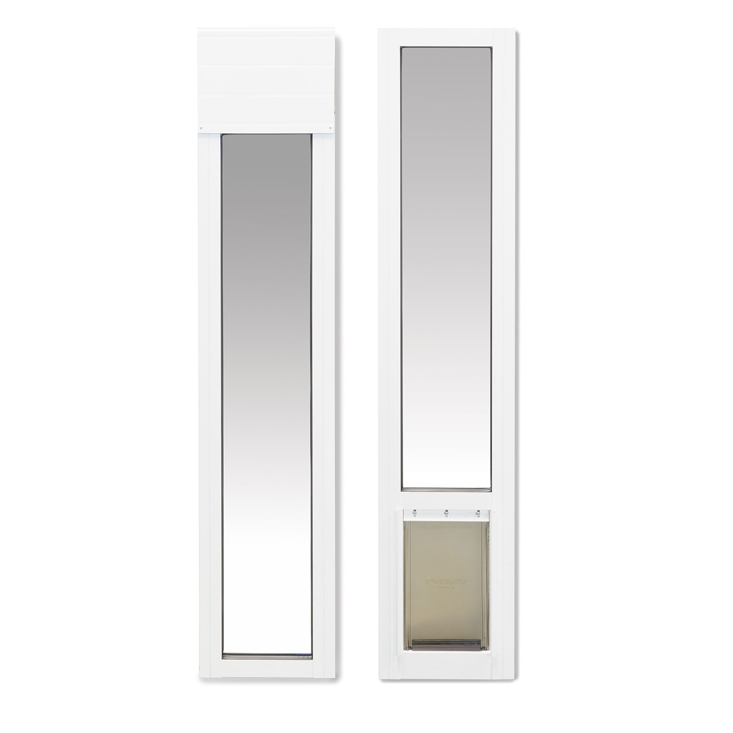 Let your pet come and go with the Sliding Glass Pet Door. No cutting or drilling required! Great for apartments or condos, this pet door gives your pet easy access to the outdoors for exercise, potty breaks, or family time on the patio. The door features a heavy-duty aluminum frame with tempered glass. The soft, flexible tinted flap has a magnetic closure and pile weather stripping along the opening for a weather-tight seal. A glass sweep and closing panel are also included for improved weather resistance. This patio pet door fits sliding glass door openings 76 13/16″ to 81″ tall. Includes: Sliding glass pet door panel, closing panel, connecting bar, weather stripping, glass sweep, adhesive, (8) 2 3/8 inch screws, (6) 5/8 inch sheet metal panel mounting screws, (8) 3/4 inches flat head sheet metal frame mounting screws, (6) T-brackets, (2) sheet metal screws, (8) keeper and latch plates 3/8 inch flat head screws, (2) latch assembly pieces and product manual. For dogs up to 40 pounds Flap opening: 8.75″ x 13.1875″ Width: 0.75″ Frame width: 11.5″ Rise: 1.75″