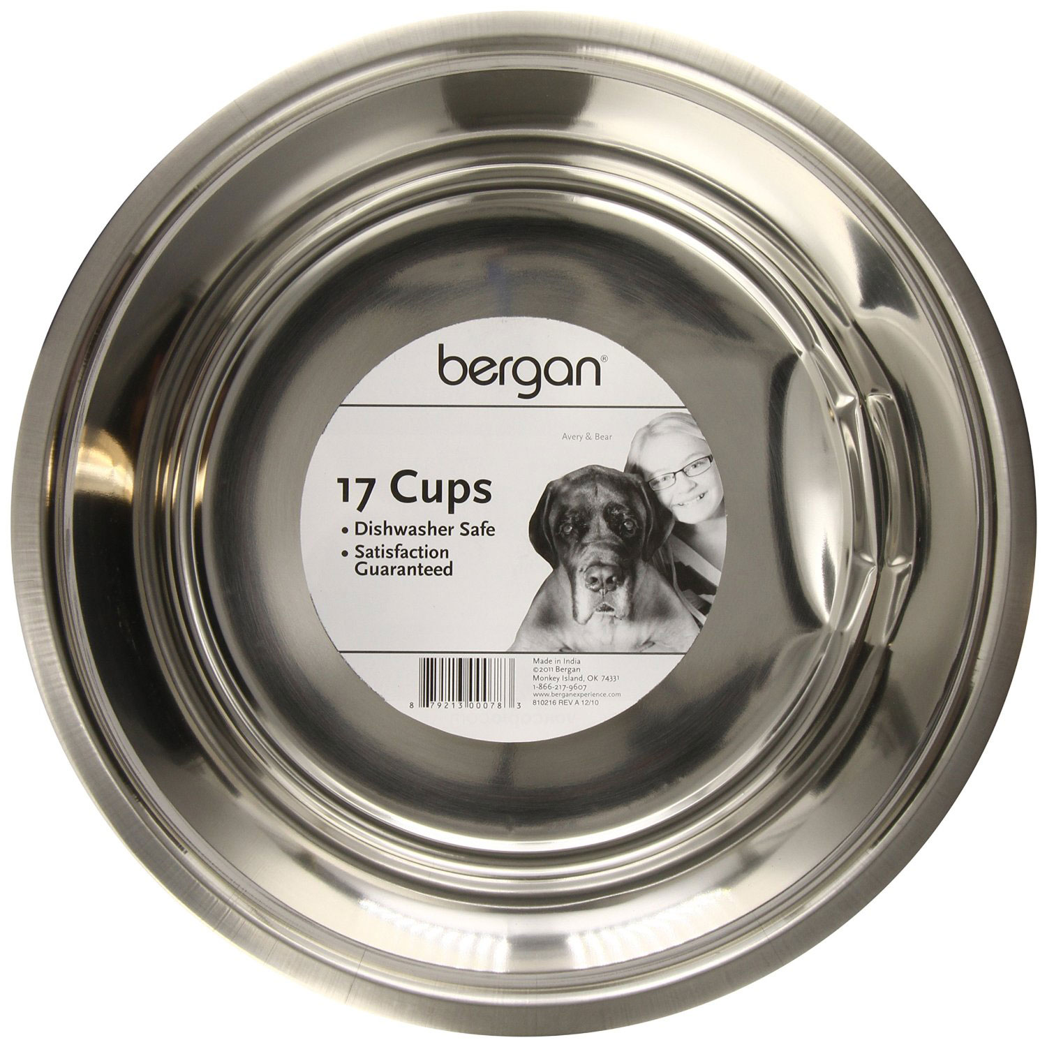 Durable stainless steel is easy to clean. Wide opening and wide base make this the perfect food or water bowl. Dishwasher safe Capacity 17 cups of dry food Capacity 136 ounces of water